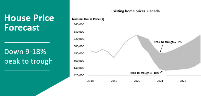 CMHC predicts a nationwide price decline of 9 to 18% from now until early 2021, then rebounding shortly afterwards for the mild case while prices under the more severe scenario would not start coming back until 2022. They expect price declines to be more severe in high priced markets like Vancouver and Toronto.