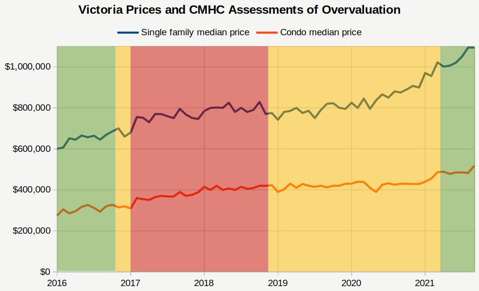 On another topic, CMHC’s Housing Market Assessments have been back in the news, and the big change for Victoria was that we got a “green” rating for overvaluation. In other words CMHC says that despite some of the largest price gains in Victoria’s history, there is no evidence of overvaluation (meanwhile some of the cheapest markets in the country are apparently highly overvalued). How can that finding be explained? Well I dug through every report they’ve released and assembled the history of their assessments vs prices for the last 5 years. The full article is in the Capital.